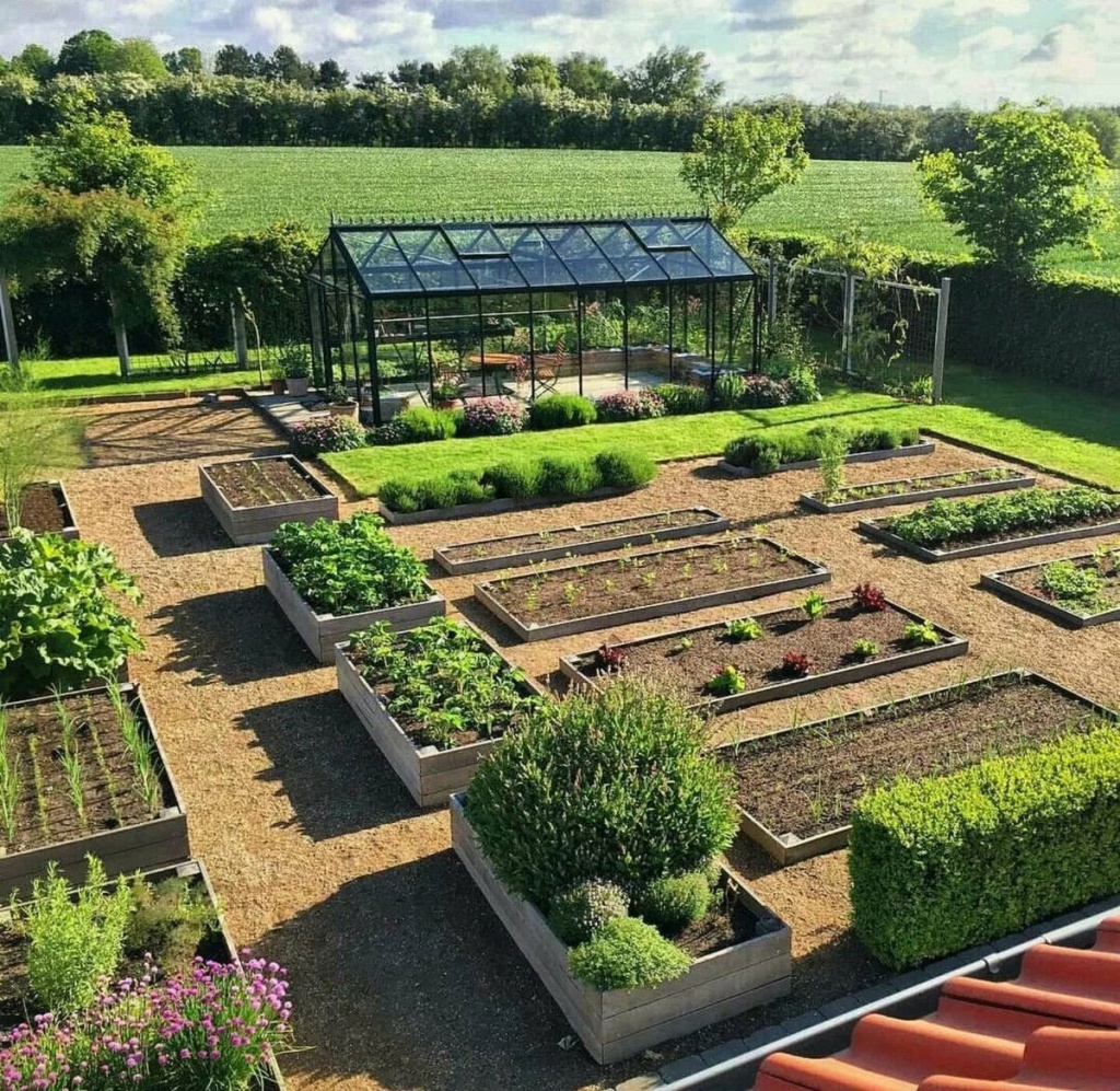 Огород. Если вы любите заниматься выращиванием овощей, ягод, фруктов, тщательно продумайте, как ваш огород будет обустроен. Обычно на эти цели выделяется не менее половины земли. Для каждой грядки по периметру лучше сделать небольшое ограждение. Для его изготовления подойдёт камень, керамогранит, дерево или кирпич. Это придаст не только эстетичный вид, но и станет практичным решением. Так, дожди не будут размывать землю.
