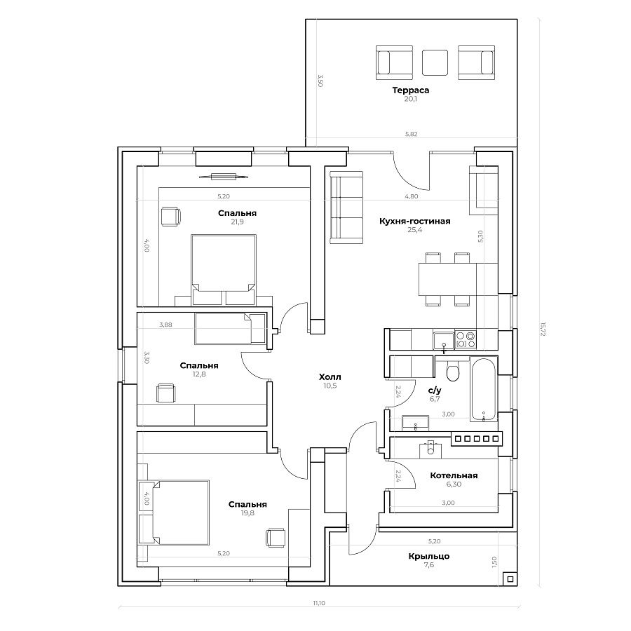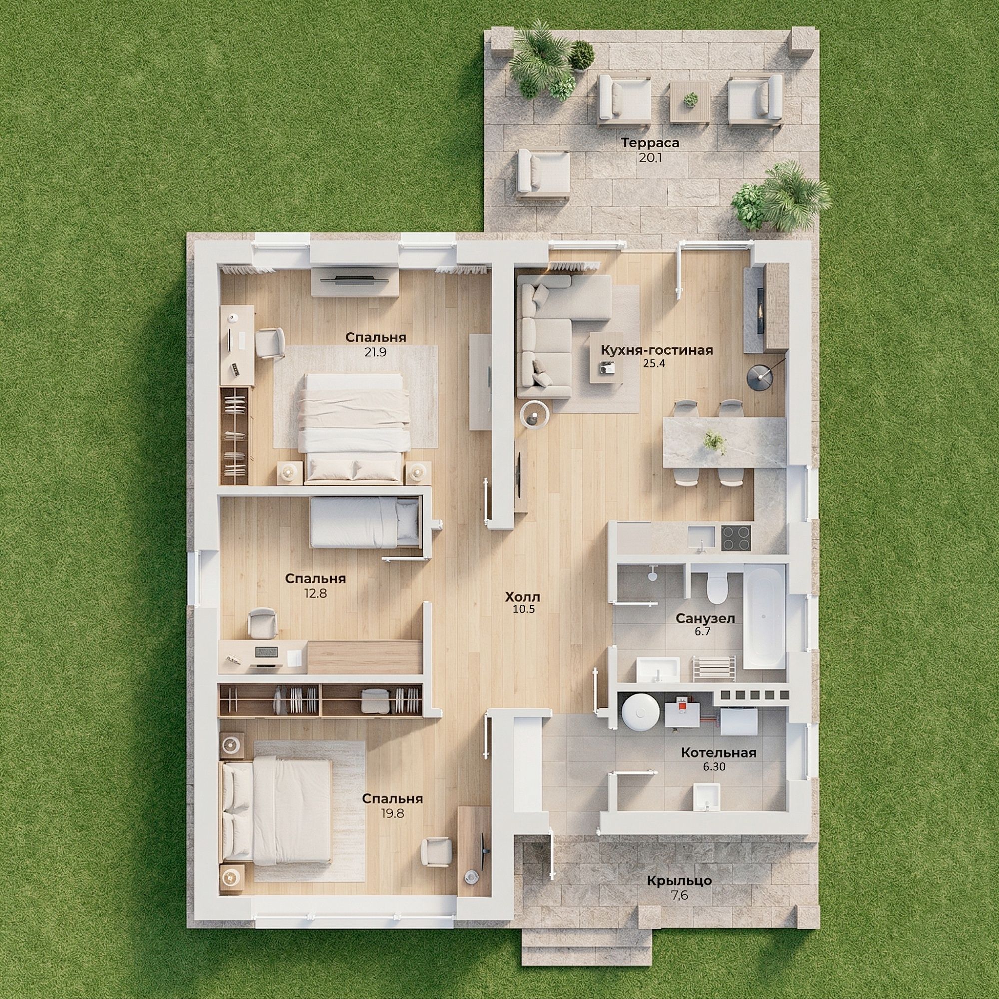 Одноэтажный дом в коттеджном посёлке Богородск Форест. Дом 140 кв.м на земельном участке 6 соток по современному проекту, состоит из 3 спален, просторной кухни-гостиной. Отопление и все коммуникации. В доме предусмотрена котельная для установки оборудования и стиральной машины.