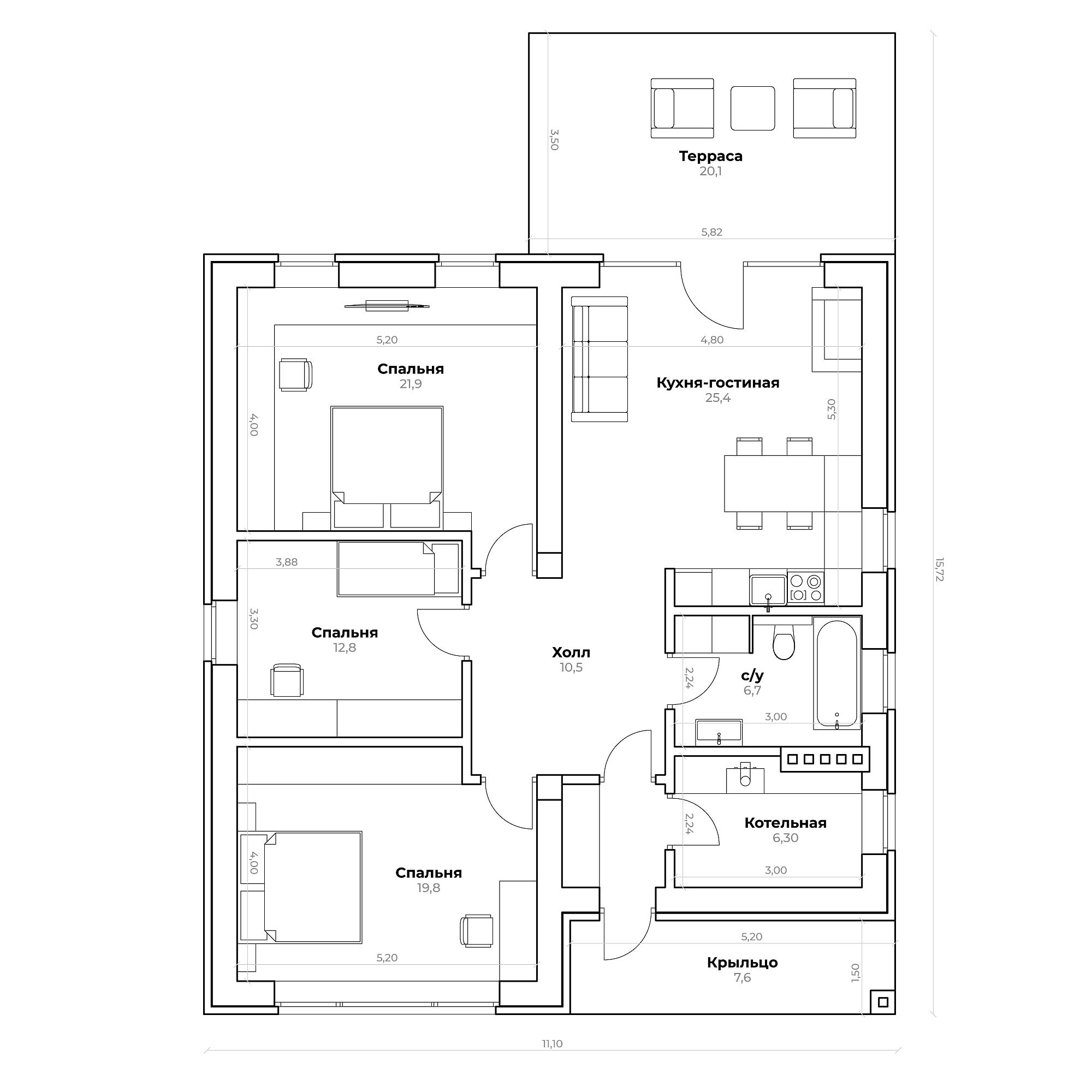 К дому будут подключены коммуникации: электричество (15 кВт), водопровод скважина, канализация септик. Участок будет огорожен забором, по фасаду евроштакетник в единой стилистике коттеджного посёлка.