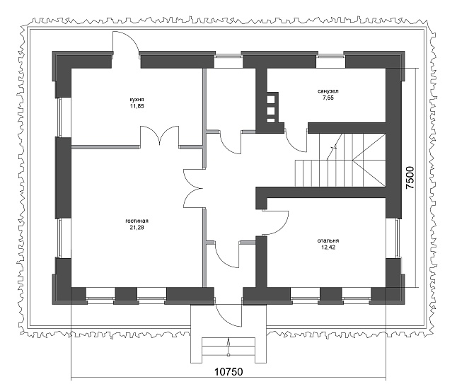 На первом этаже дома предусмотрена гостевая комната с возможностью постоянного проживания. Также на первом этаже дома расположены кухня, гостиная-столовая, санузел, кладовая. Из гостиной-столовой можно организовать выход на террасу (опционально).