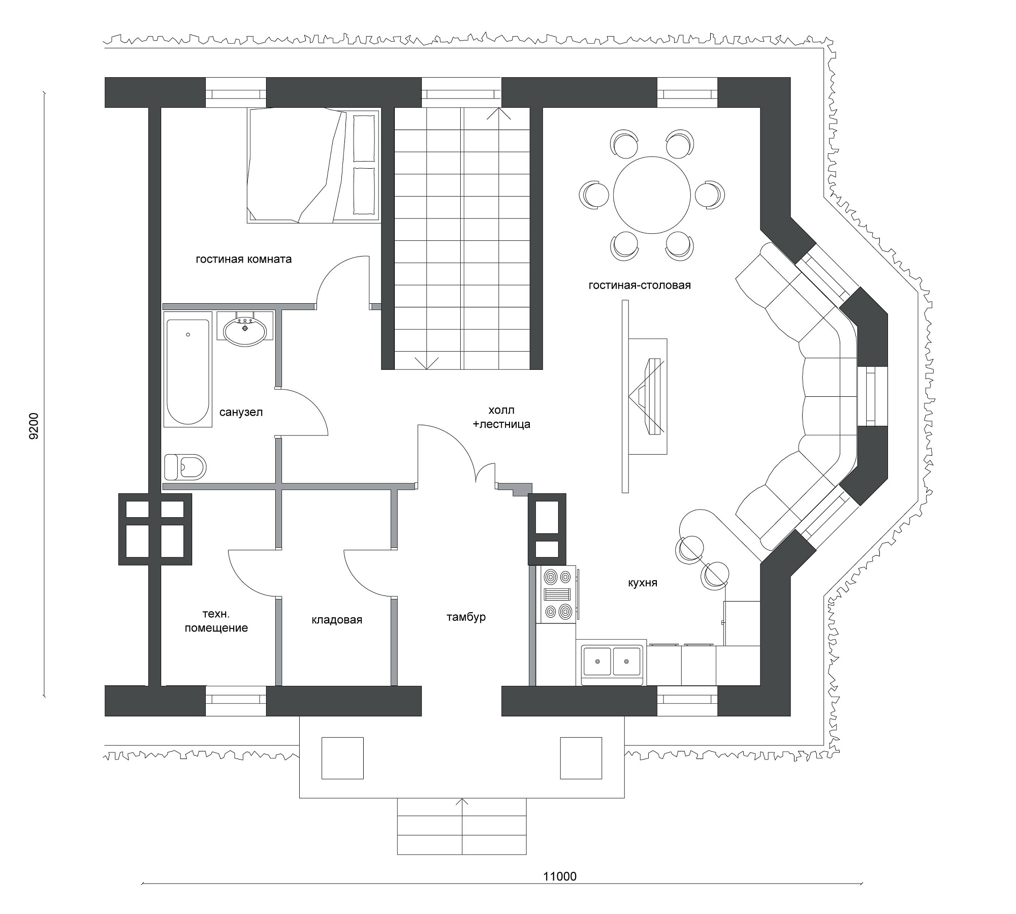 На первом этаже дома предусмотрена гостевая комната с возможностью постоянного проживания. Также на первом этаже дома расположены кухня, гостиная-столовая, санузел, кладовая. Из гостиной-столовой можно организовать выход на террасу (опционально).