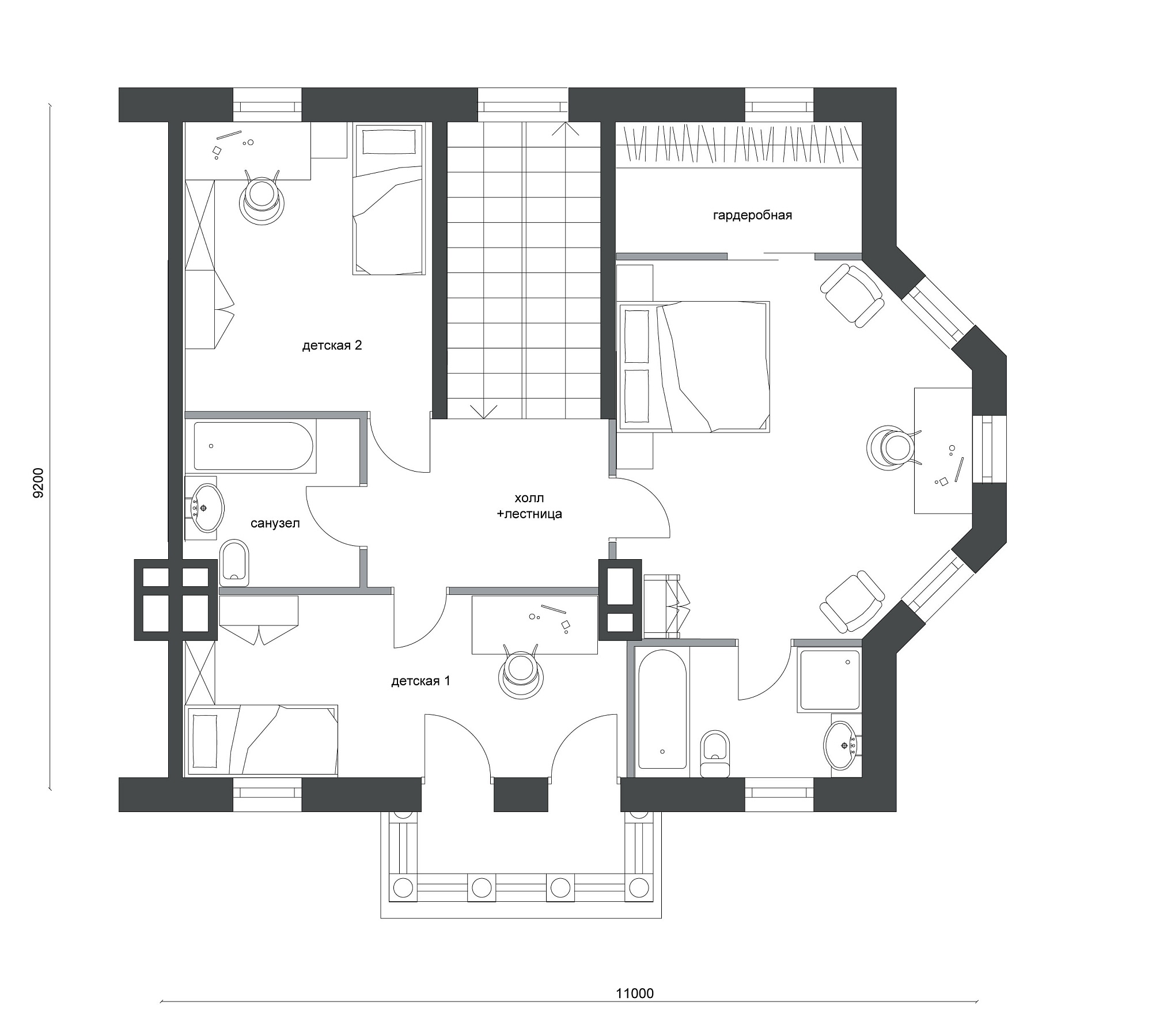 На втором этаже располагаются спальные помещения и детские комнаты. Благодаря свободной планировке на втором этаже можно организовать четыре комнаты.