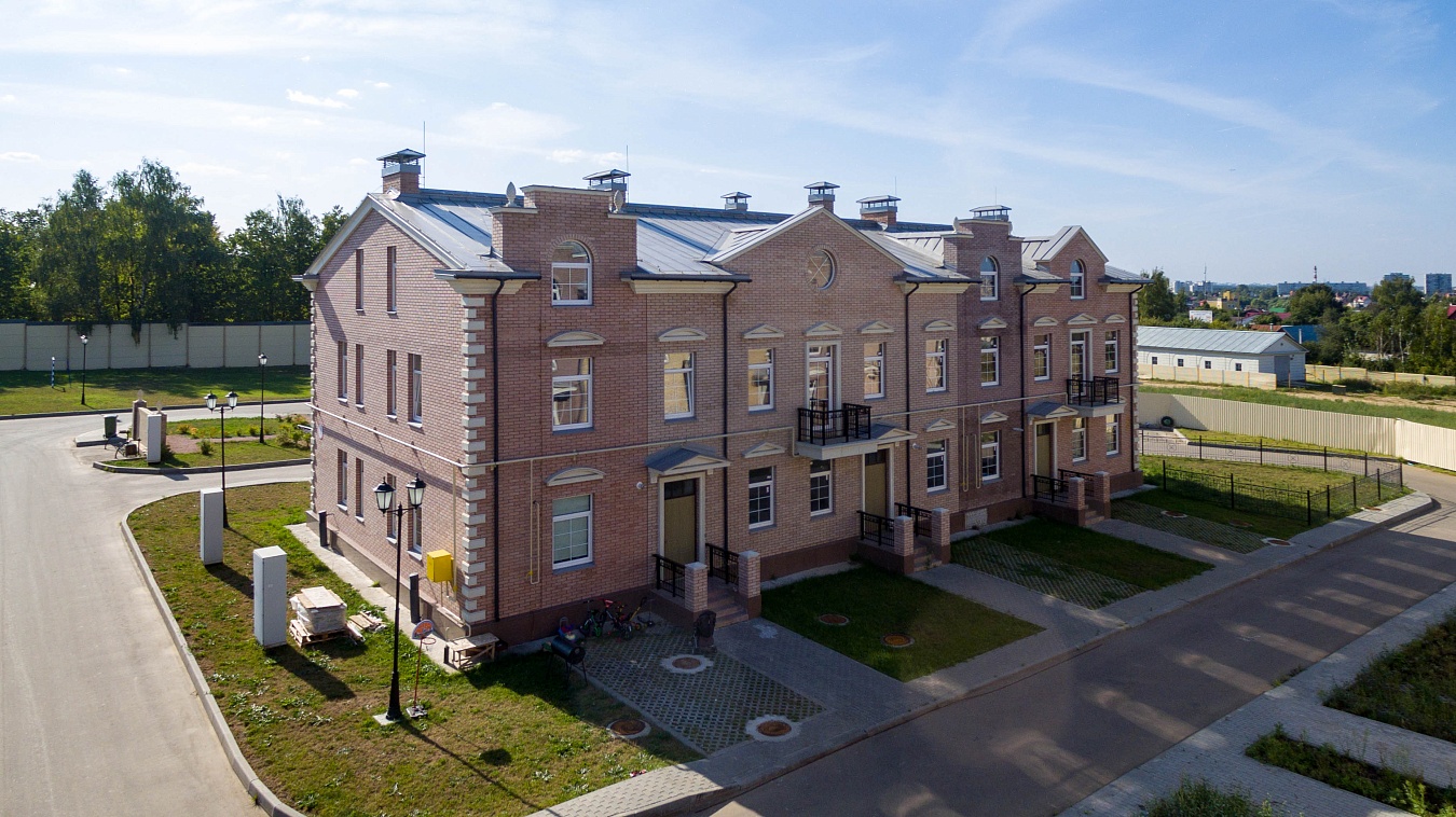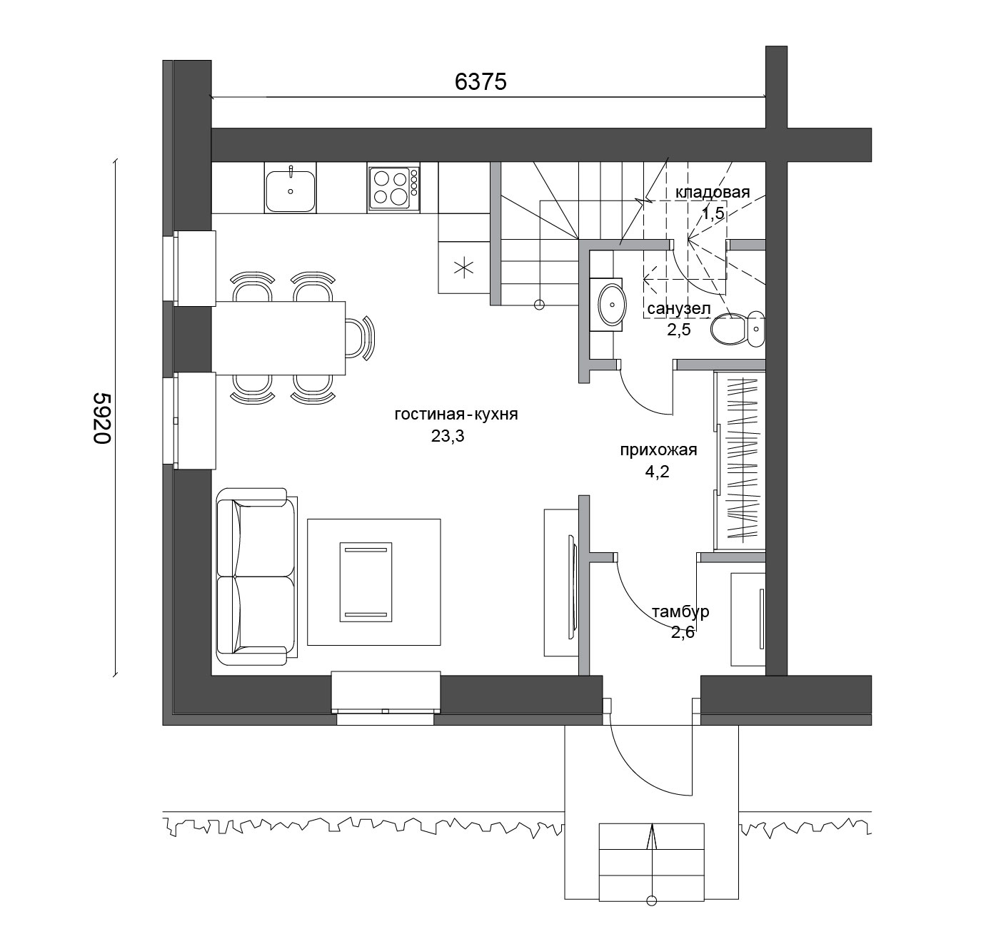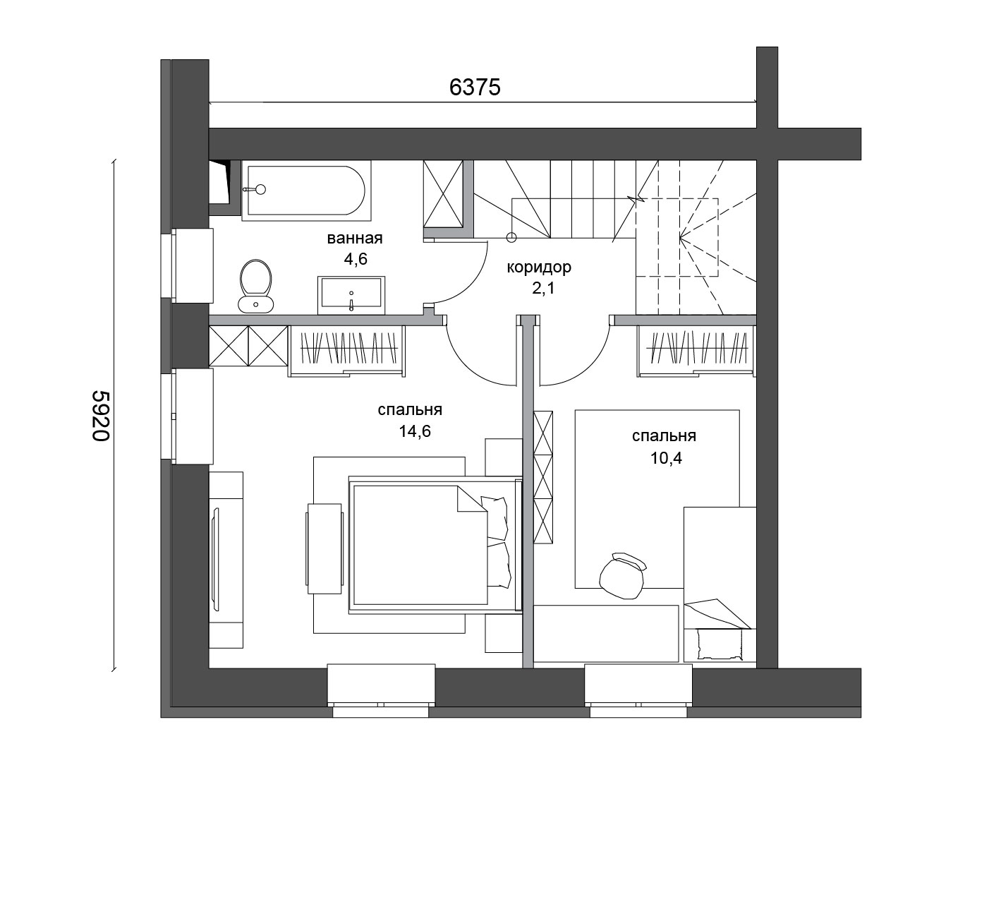 На первом этаже расположена просторная кухня-гостиная, на втором этаже две спальни или детские комнаты.