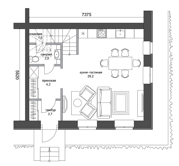 На первом этаже расположена просторная кухня-гостиная, на втором этаже две спальни или детские комнаты.